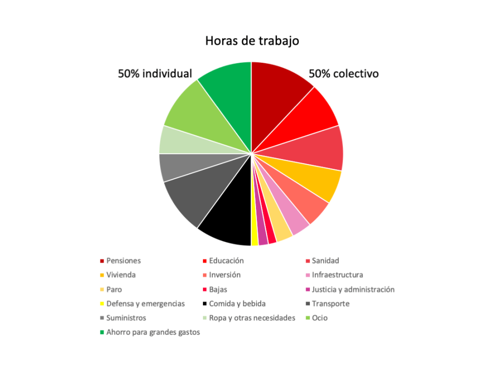 Ya se ha mencionado a lo largo del escrito que el 50% de los tempos se gastarán para lo público y el otro 50% para lo individual (para lo colectivo del sueldo va el 20% en el alquiler de la vivienda, 20% en el alquiler de tierras y locales para la producción y 10% de impuesto directo al trabajo). Sin duda es algo que podrán cambiar de forma democrática los ciudadanos, pero, para aclarar por qué se han elegido esos números, podemos ver cómo podrían distribuirse las horas de trabajo, es decir, los tempos, en este sistema.
